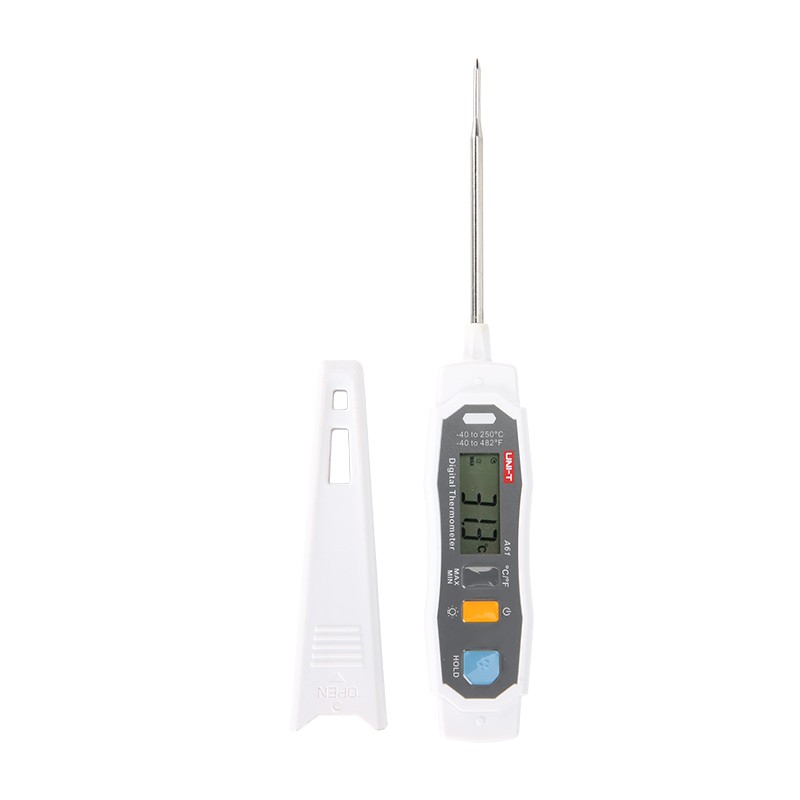 型號:A61探針型溫度計產品介紹:A61是一款達到IP65防護等級的探針型溫度計,適合于浸入或刺入物體內部測量溫度,可測量液體、糊狀物、半固體等物質的內部溫度,具有雙色報警燈提示,℃/℉單位切換,主要作為家用及制冷制熱、食品加工行業測溫使用。