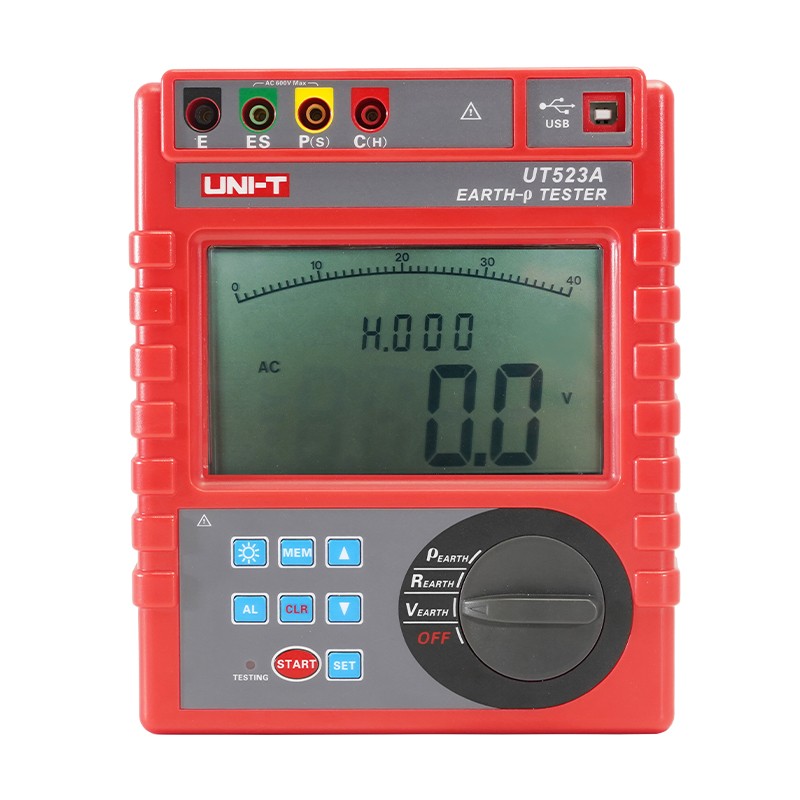 UT523A智能接地電阻測試儀專為現場測量接地電阻、土壤電阻率、接地電壓、交流電壓而精心設計制造的,采用最新數字及微處理技術,精密4線法、3線法和簡易2線法測量接地電阻,導入FFT(快速傅立葉變換)技術、AFC(自動頻率控制)技術,具有獨特的抗干擾能力和環境適應能力,重復測試一致性好,確保長年測量的高精度、高穩定性和高可靠性。其廣泛應用于電力、電信、氣象、油田、建筑、防雷及工業電氣設備等的接地電阻、土壤電阻率、接地電壓、交流電壓測量。