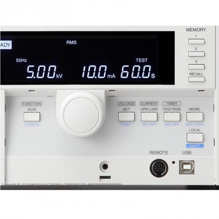 因為不受AC 輸入端電壓和頻率變化的影響,可保持安定的輸出電壓,所以在電源環境不安定的區域也可進行安定,安心的測試。裝備有充實的對應各式各樣用戶要求的機能。這是一款基于操作性/ 實用性/ 安全性/ 低價格為一體,AC 耐電壓測試儀的[ 標準] 型號。